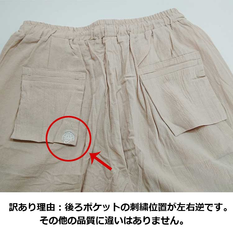 商品詳細 サイズ 単位:CM ※誤差(1cmから3cm)が生じる場合がございます ・XXL(33-34) ウエスト幅37・ヒップ幅72・ワタリ幅40・裾丈72(長い部分82) ※普段L〜XLサイズの方にお勧めです! 色 4-IVORY生成 素材 麻/綿 特徴 生地の伸縮:なし 生地の厚み:普通 訳あり理由:後ろポケットの刺繍位置が左右逆です。