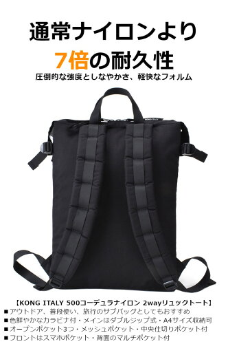 【KONG ITALY 500コーデュラナイロン 2wayリュックトート 53005】 通常のナイロンに比べ、約7倍の耐久性があるコーデュラナイロンを使用。